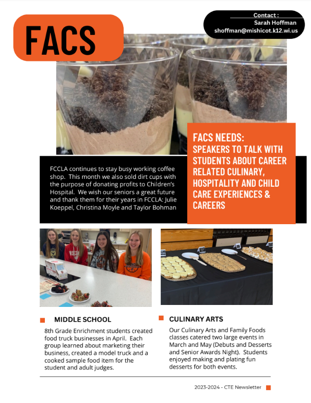 The career and technical education (CTE) teachers at Mishicot School District have put together this term four newsletter to share the celebrations happening in CTE in our schools. Thank you for being a partner, supporter, advocate, or friend to CTE in the past! We look forward to partnering with you in the future.